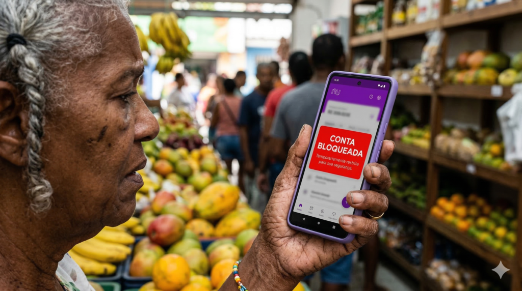 Imagina a cena. Você vai no supermercado, enche o carrinho, chega no caixa e, na hora de passar o cartão ou fazer o Pix, a transação simplesmente não aprova. Você abre o aplicativo no estacionamento e descobre que sua conta está bloqueada. Sem aviso prévio, sem mensagem, sem nada. E o pior: como é um banco 100% digital, você não tem uma agência física com uma porta giratória para entrar, tomar um chá de cadeira e pedir satisfação para o gerente. Você tem que resolver tudo pelo chat do celular ou por telefone.